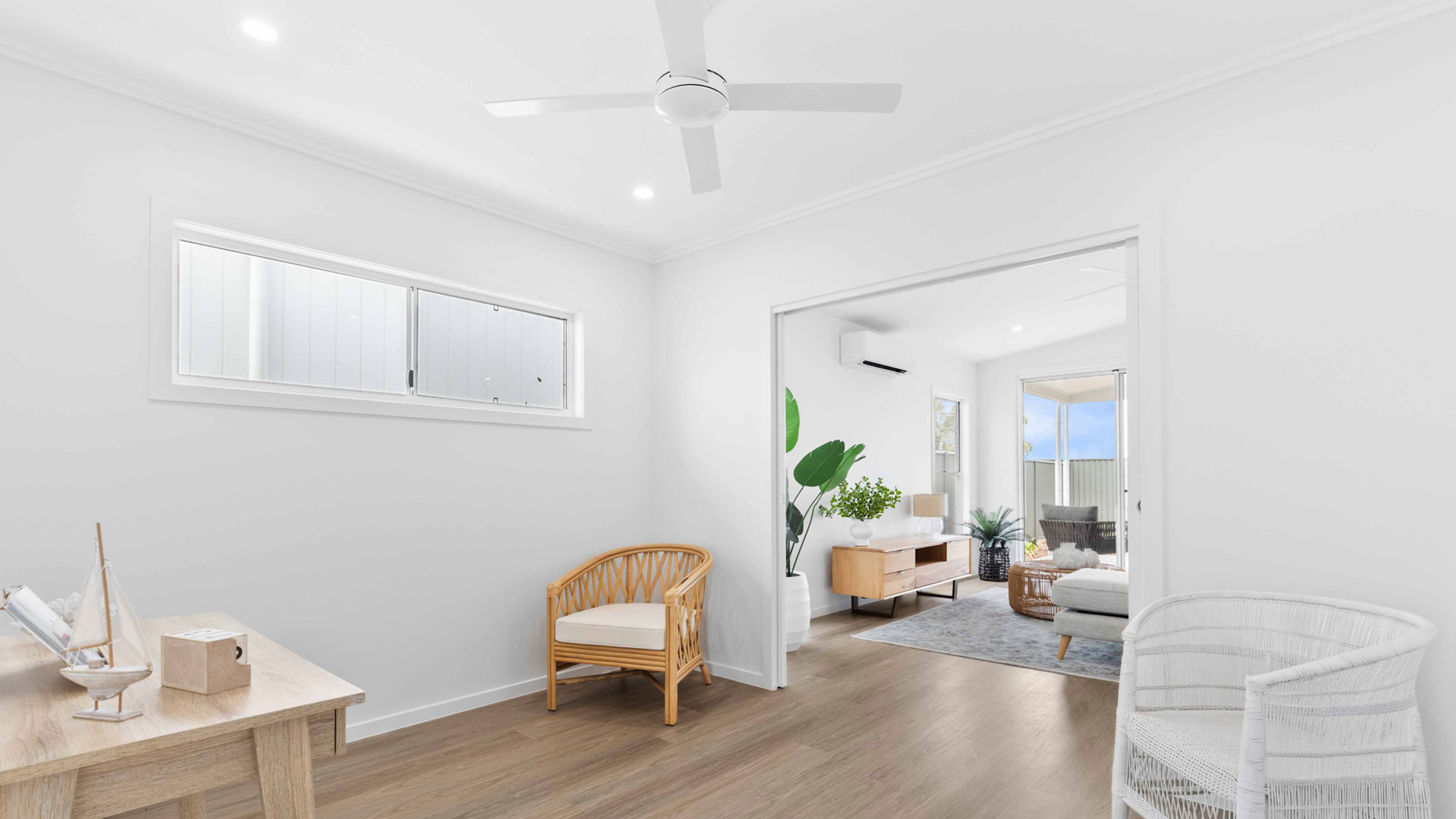 A sliding door also opens onto the undercover alfresco allowing for cool breezes to cool the room.