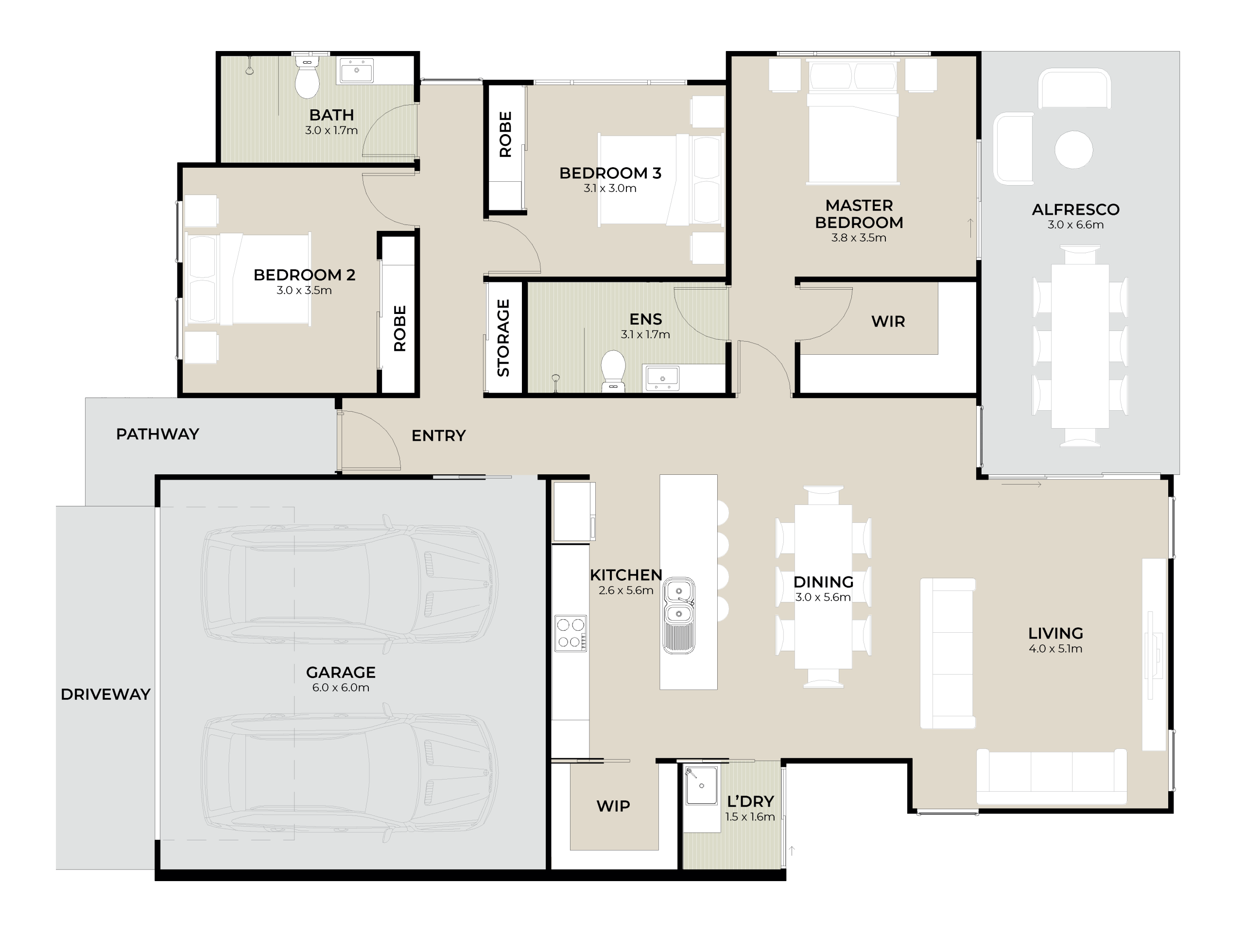 Complete with three spacious bedrooms, including a master bedroom with walk-in wardrobe and accompanying ensuite, laundry room, double garage and other amenities, this home design offers a space for you to unwind and relax at the end of each day.
